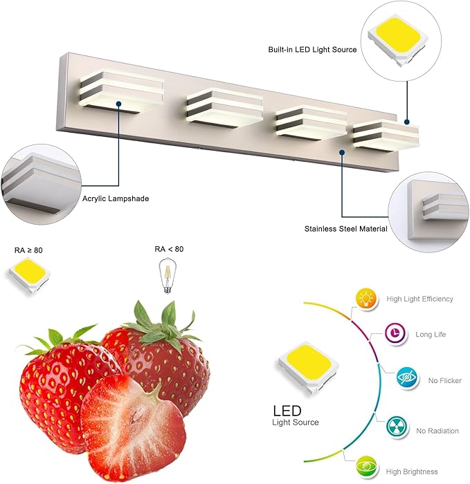 - High quality structure: This modern bathroom lighting fixture is made of industrial grade metal and coated with brushed nickel anti-corrosion coating, which has excellent durability, dust, fog, and moisture resistance. The milky white acrylic diffuser provides soft, glare free illumination while maintaining excellent transparency