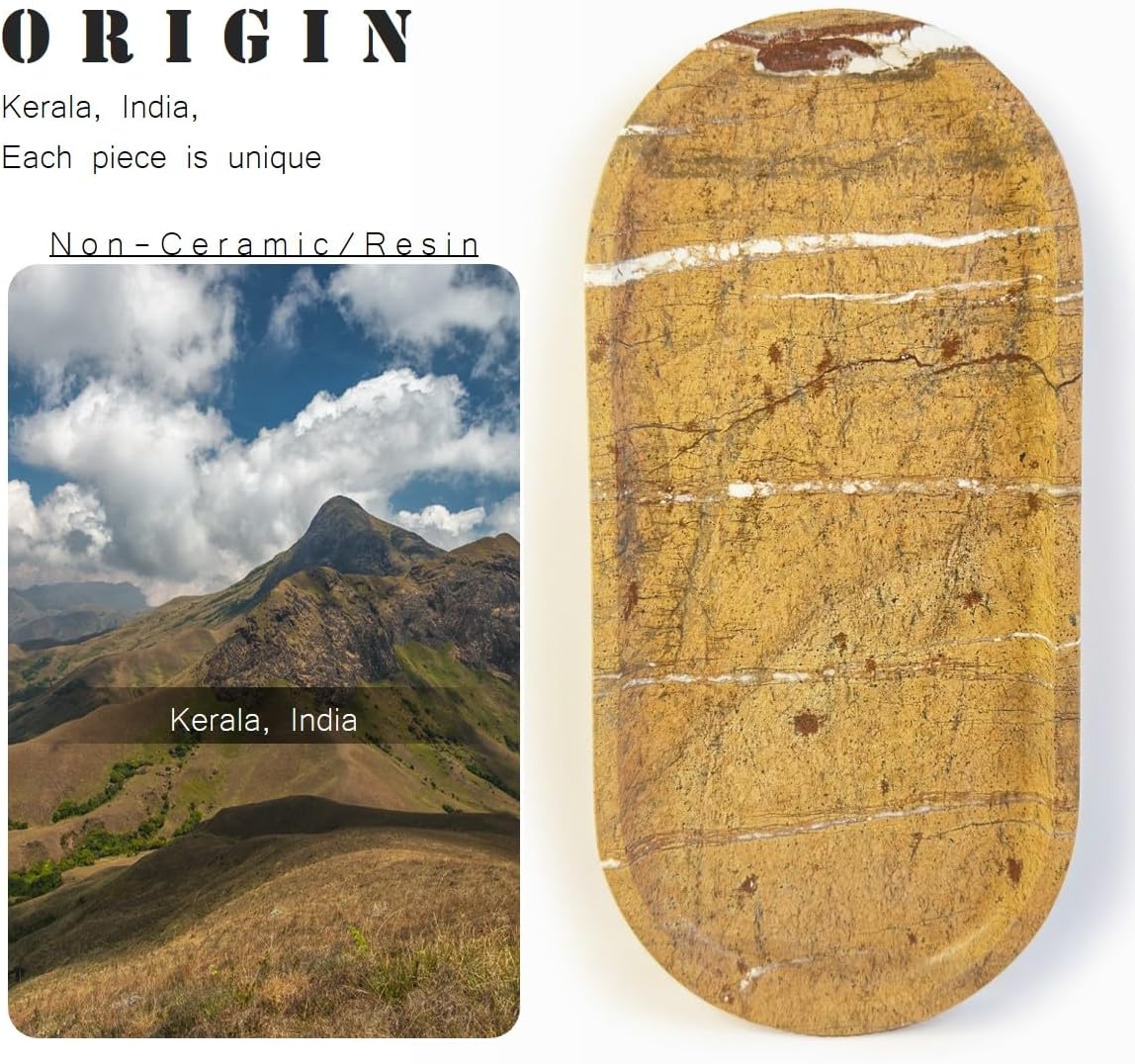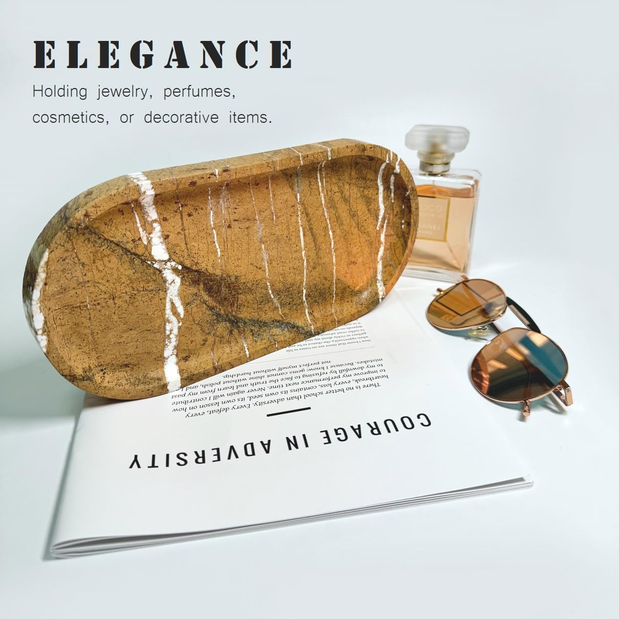 - NATURAL MARBLE FROM INDIA: Made from premium Brown Rainforest marble sourced in Kerala, India. This marble oval tray showcases the natural beauty of stone with unique earthy veins and rich brown tones. A durable luxury stone tray that is stain-resistant, long-lasting, and perfect as a decorative tray for jewelry, perfume, or candles