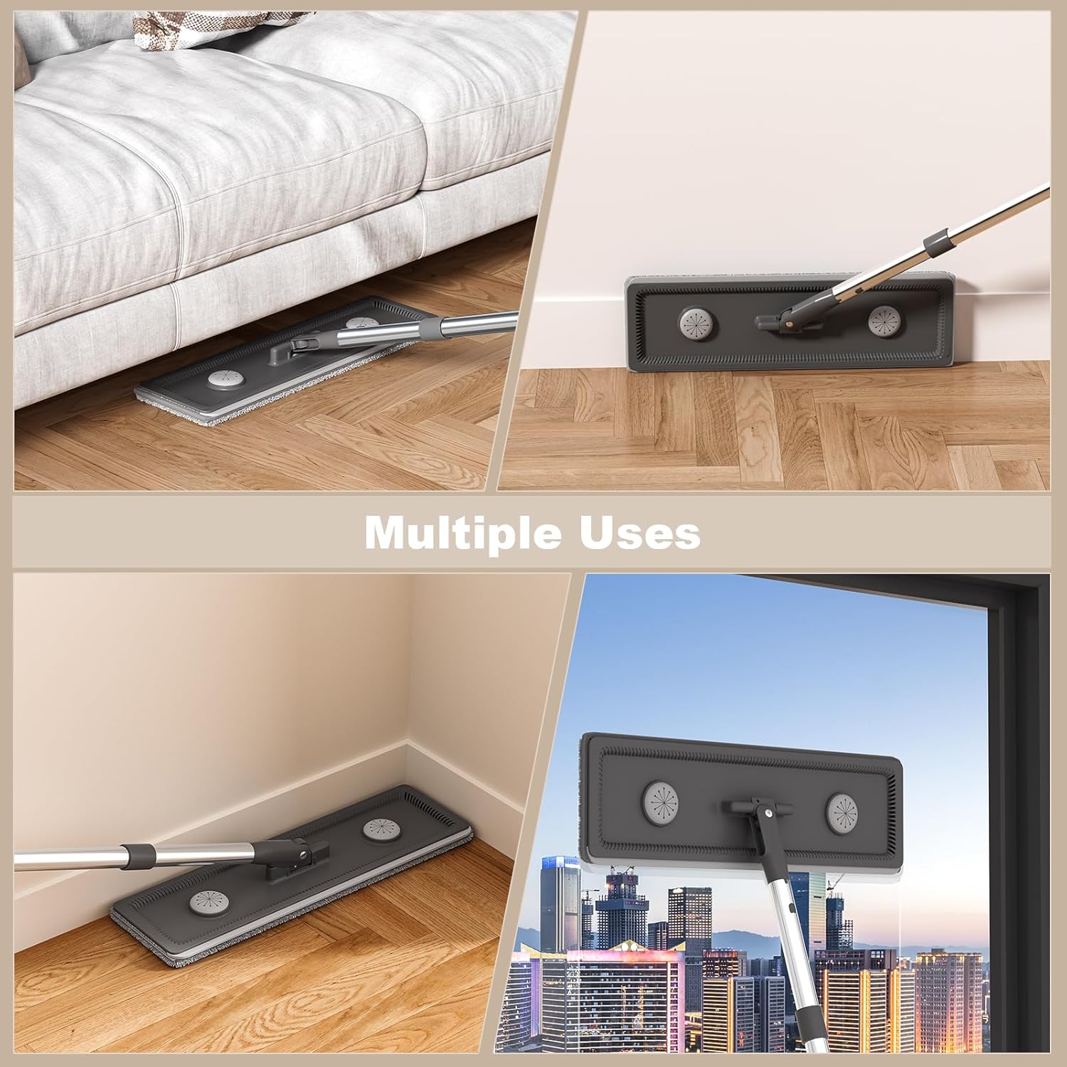 - REACH INTO : flat floor mop have 360°rotatable rectangular mop heads which makes it more suitable for cleaning corners and narrow spaces than triangular and round mops. Perfect for floor and window cleaning in home and office.