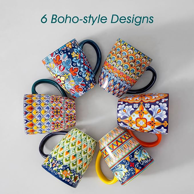 - 【Bohemian Coffee Mugs】This ceramic mugs set includes six 16 oz cups (4.5"H x 5.4"W with handle) featuring unique boho patterns, perfect for coffee, tea and gift giving