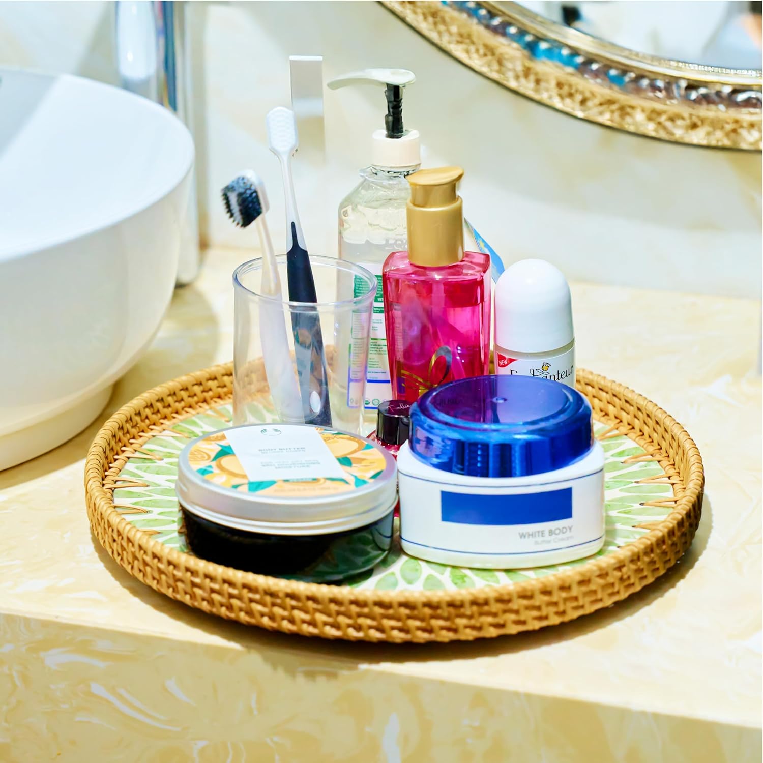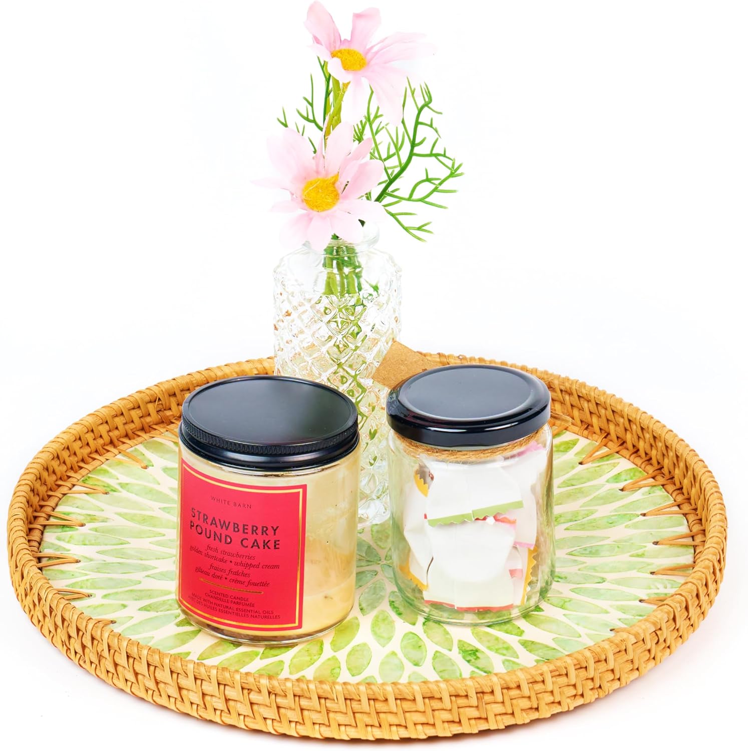 Round 12" Rattan Serving Tray with Mother of Pearl Inlay, Decorative Wicker Tray with Wooden Base for Coffee Table, Bread, Fruit, Food Display and Storage (Leaf)