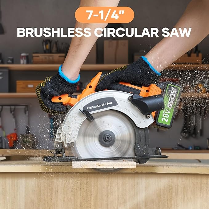 - 7-1/4-inch Circular Saw: The battery circular saw boasts a maximum cutting capacity of 7-1/4-inch, which can easily handle large plate cutting. The small circular saw cordless is equipped with an ergonomic non-slip soft rubber handle, which is comfortable and stable to hold