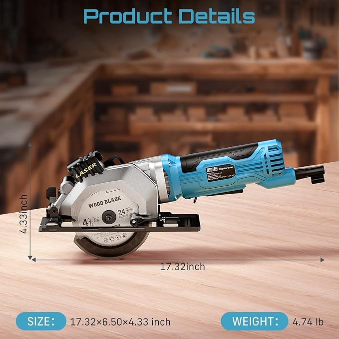Seesii Mini Circular Saw with Laser Guide,4.8A 4000 RPM Compact Corded Circular Saw with Rip Guide,3 Blades (4-1/2") for Wood,Soft Metal,Tile,Plastic Cutting,Max Cut Depth 1-11/16"(90°),1-1/8" (45°)