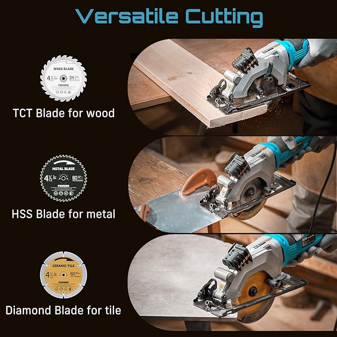 - Versatile applications: The compact Circular Saw has 3 blades (4½"), including TCT, HSS and diamond blades. It can cut for wood, soft metal, tile, plastic, achieving multi-material versatility.The electric compact circular saw is suitable for diy and home tasks