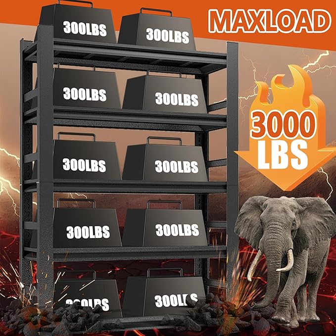 - 【Heavy-Duty 3000lb Garage Shelving】 Our heavy duty garage shelving boasts a 3000lb capacity, reinforced by double-thick steel columns. These industrial shelves provide ultimate durability for garage storage shelves, basement storage shelves, and workshops.