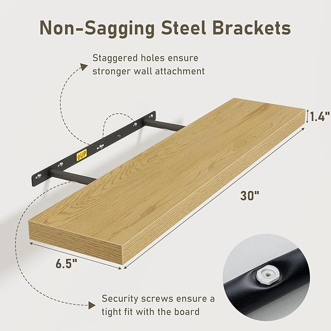 - 30 Inch Floating Shelves for Wall (Set of 3): Each wall shelves are 6.7 inches in depth and 1.4 inches in thickness. 3-piece set is more cost-effective and practical. Our wall shelf can be used in combination, staggered high or low on the wall, or mounted side-by-side to provide extra storage space for organizing small items and clutter in multiple areas such as kitchens, bathrooms, and bedrooms, creating a clean and smooth look. Multiple colors available