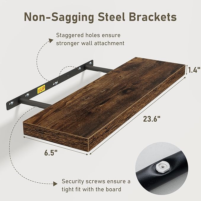 - Easy To Assemble: This floating shelves not only come with stainless-steel galvanized invisible brackets, but also equipped a fixing screw at the bottom to fix the shelf on the support rod, which solves the problem of sliding and is not easy to damage, and can be used for a long time. Instructions, magnetic level, drywall anchors, and screws included. This is great because you can easily mount these rustic shelves Gap-Free to any surface in less than 10 minutes