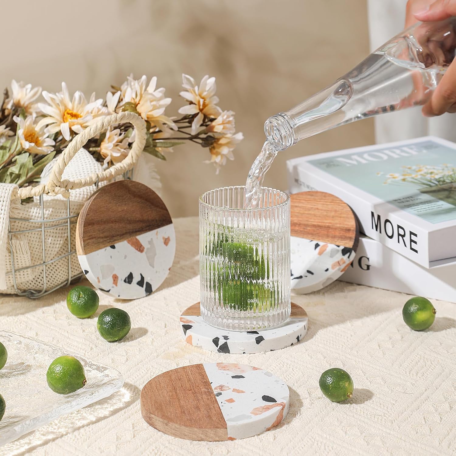 Drink Acacia Wood-Marble Coasters Set of 4,Cup Coaster for Coffee,Beverage,Cute Modern Cool Coasters for Home Decor,Table Desk Coaster Set for Housewarming,Living Room Decor (White-Wooden)