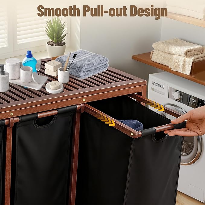 Bamboo Laundry Hamper 3 Section with Lid, 150 L Laundry Sorter with Pull-Out Removable Washable Bags, 3 × 12.5 Gal Divided Laundry Baskets for Laundry Room, Bathroom (Black)