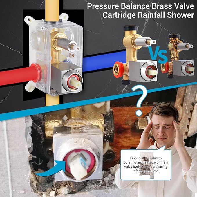 - Includes: 10-inch square fixed shower head, handheld shower head, shower arm rod, shower hose, shower base, and shower faucet rough-in valve body.