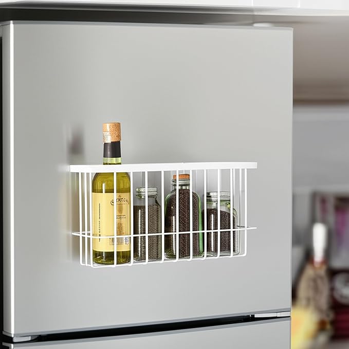 - Magnetic Fridge Organizer: Features large magnetic pad that adhere to refrigerators, washing machines, or file cabinets without damaging surfaces. The magnetic basket blends with any room decor.