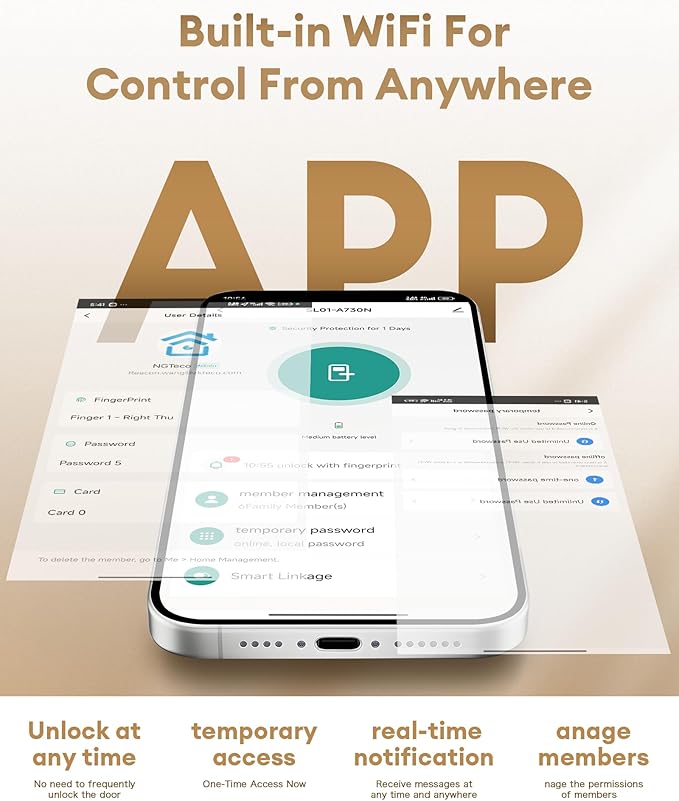- Real-Time Management: Via NGTeco Home APP, this smart lock for front door lets you control access anytime. Remotely lock/unlock, share virtual keys, generate temp/periodic passwords, and check real-time access logs. It has distinct admin/user roles and supports multi-lock sync management