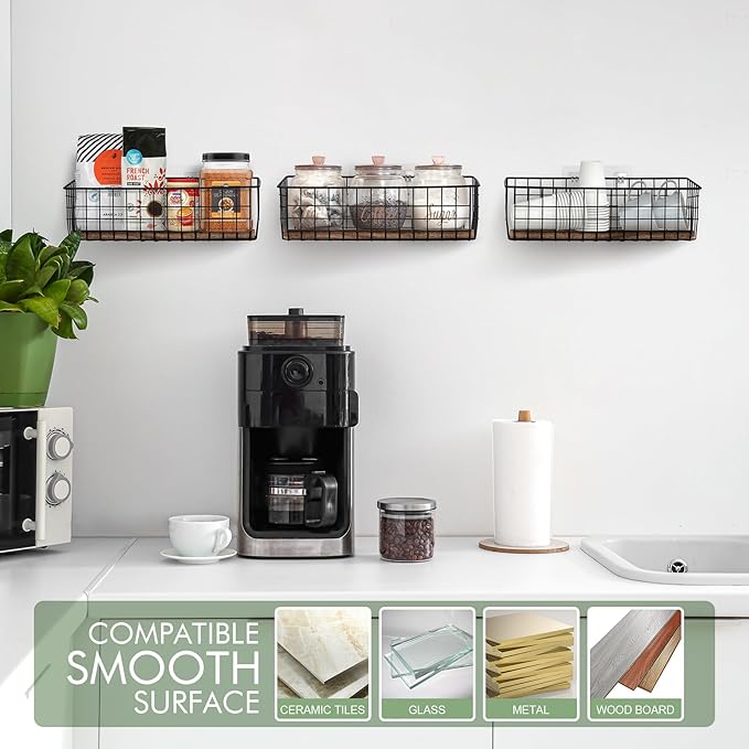 - Flexible Installation - 2 wall mount solutions. Come with adhesive stickers and a screw hook set. The non-trace stickers for holding things below 22 lbs in baskets work with any smooth and clean texture like glass, ceramic, or cabinet. Metal hook screws are available for needs over 44 lbs.