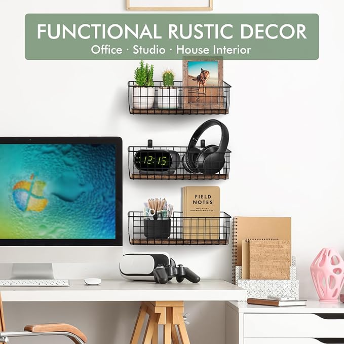 Wall Hanging Baskets 3 Pack, Extra Large Diversified Wire Basket Shelves of Wooden Style, with Wall Mounted Hooks & Traceless Stickers, for Kitchen Coffee Bar Office Room Garage Storage Organization