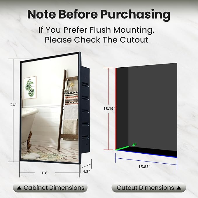 - 【Flexible Installation】The bathroom medicine cabinet with mirror 18 by 24 can be surface mounted or recessed to the wall, The Medicine cabinets' door can be open on both side. Compatibility with bathrooms of all sizes and styles. Mounting hardware and installation instruction included. Almost No Assembly Required