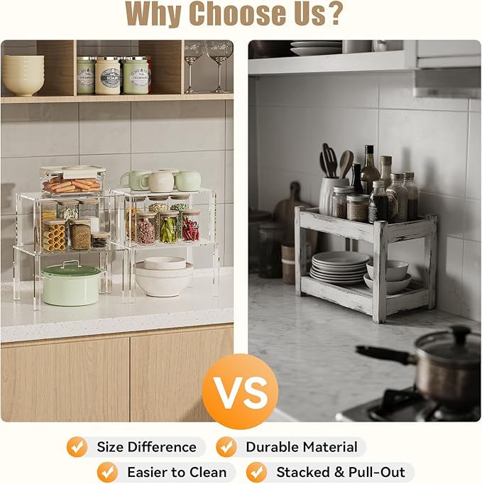 - Maximizes Vertical Space & Organizes Efficiently - Set of 4 acrylic shelves creates dual-layer storage in cabinets, perfectly holding spices, plates, jars, and mugs. Save 50% kitchen space with this counter shelf organizer—keep essentials visible and neatly displayed!