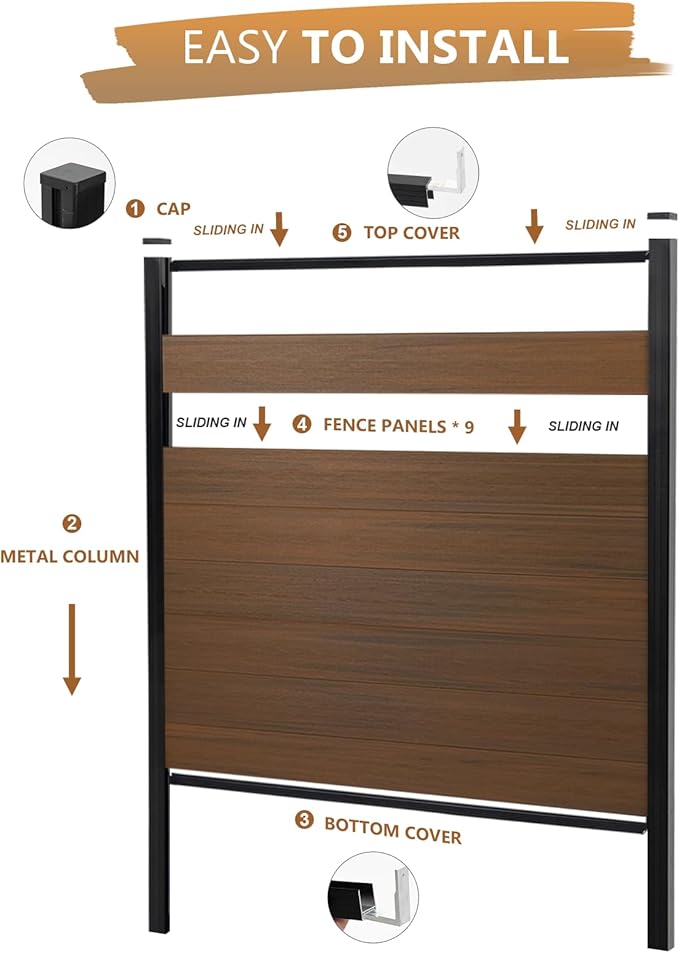 - Sturdy & Long-Lasting Construction Our 6x6 FT privacy fence panel is built with high-density wood-plastic composite (WPC) material—unbreakable, waterproof, and UV-resistant to withstand sun, rain, and wind without fading or warping. The reinforced metal post and base provide extra stability, ensuring years of reliable use.