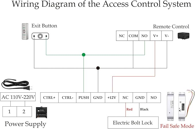 - Complete Access Control Kit - Includes electric drop bolt lock (Fail Safe mode), power supply controller, exit button, 4 remote transmitters, 1 receiver, and power cord - everything you need for setup.