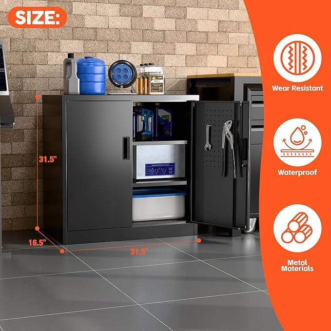 - Large Capacity - Metal storage cabinet measuring H31.5" x W31.5" x D16.5" features 2 adjustable shelves. The metal cabinet can hold up to 120 lbs, metal garage cabinet guaranteeing maximum adaptability and convenience for your unique storage and organizing needs.