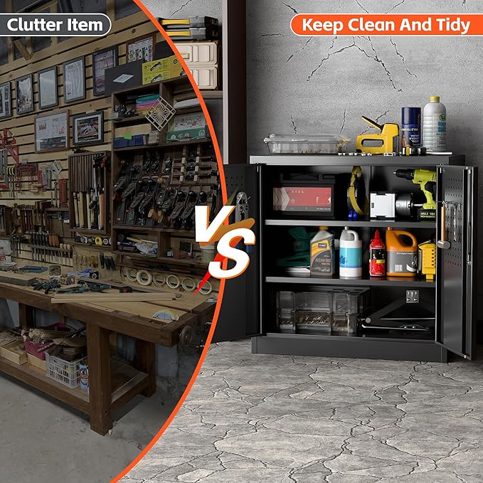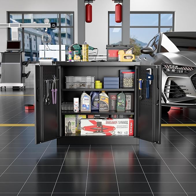 - Locking Doors and Pegboards - The metal garage storage cabinets have a lock and two keys that come pre-installed in each of our garage cabinets, metal storage cabinet with doors and shelves. You will receive a second key that can be used by a co-owner or as a spare in case you lose the original.