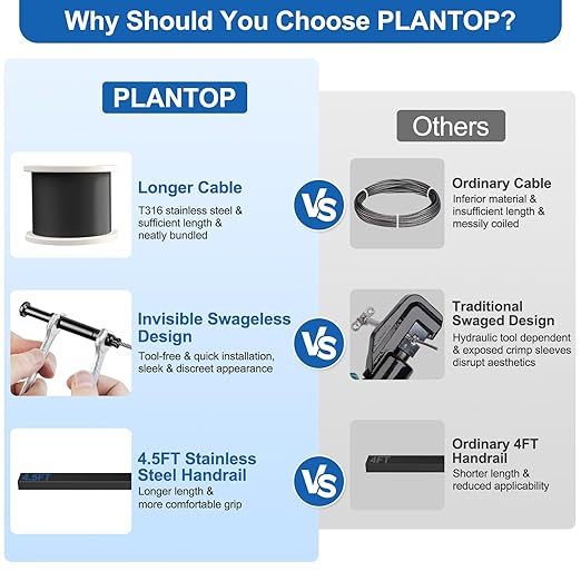 - 【Expand Options & Customization】 To help you build black cable railing system more efficiently, we recommend the following products from PLANTOP,including handrail MY01, handrail connectors MY02-E, MY02-S, MY02-C, MY02-L, cable railing post MY08-S, MY08-L, MY08-S, cable railing post kits MY06, MY07, MY20-SP, MY20-LP, swageless cable fittings MY14, cable railing anchor terminal MY14-B, stainless steel cable MY15, side mount post MY09-S, MY10-LP, MY10-SP