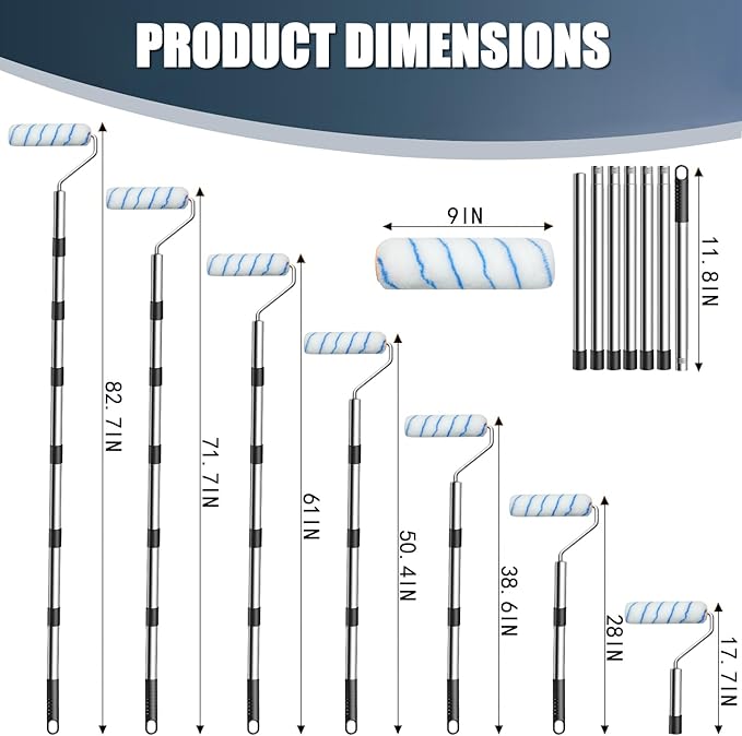 - 【Safe and Convenient】:Our Paint Rollers with long handle make it easy to paint walls and ceilings without the need for a ladder, making it safer and more efficient.2.6FT~7.2 FT adjustable pole can make you don’t need a ladder. The pole is a general-purpose stainless steel pole and can be extended indefinitely.