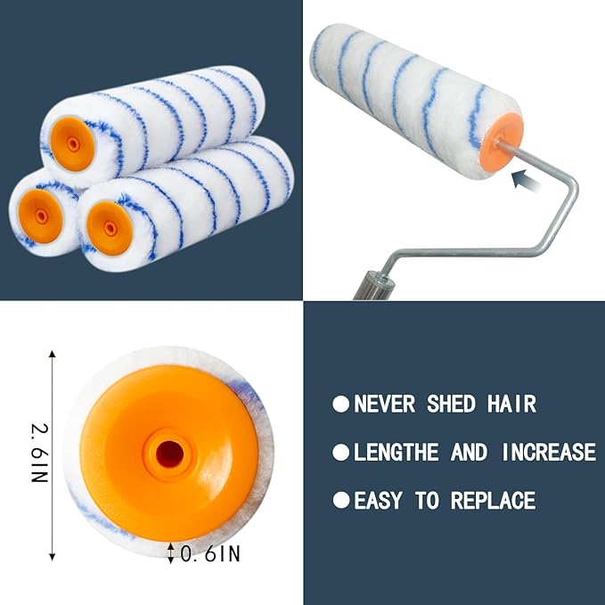 - 【9inch Non-shedding Paint Roller】: Composed of high quality synthetic fiber filaments, no bristles fall off and has uniform texture,can fast absorb and release a large amount of paint, brush the wall more evenly.3Pcs Rollers Included, Easy to clean for long time use.