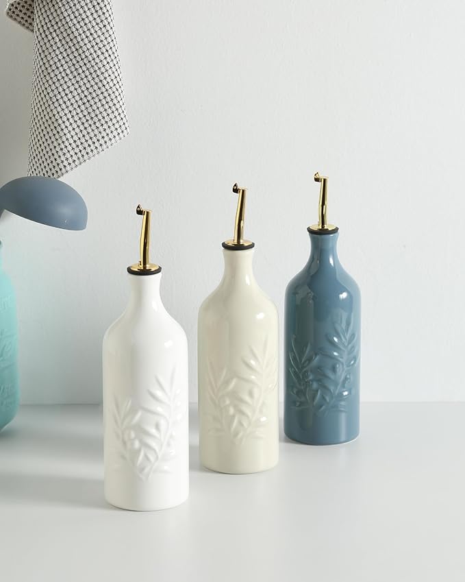 Sweejar Ceramic Olive Oil Dispenser Bottle 20 Oz Relief Opaque Oil Cruet Protects To Reduce Oxidation Suitable for Storage Vinegar, Soy Sauce, Coffee Syrup, Liquids, Set of 1 (White Gold Spout)