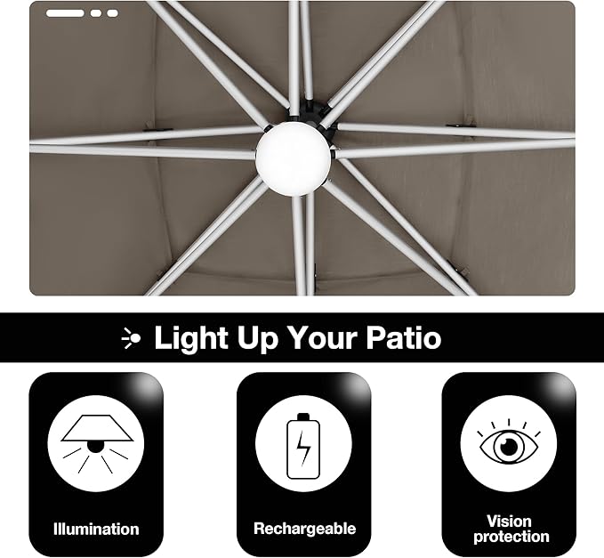 - Chargeable light(No battery): Eliteshade cantilever offset patio umbrella comes with a chargeable central light, offering brighter illumination, ensuring prolonged brightness.