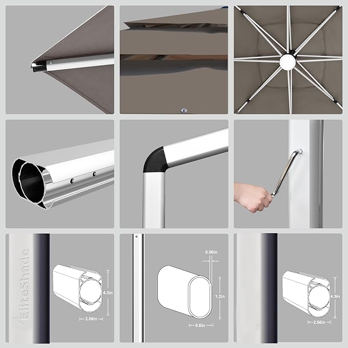 - 10-Year-Non-Fading Fabric: Eliteshade cantilever offset patio umbrella Crafted with fade proof, UV, stain and water Resistant High performance acrylic fabric known as EliteShade tuff skin. The Skin Cancer Foundation recommends this kind of acrylic fabrics in shading products as part of a complete sun protection regimen Fabric.