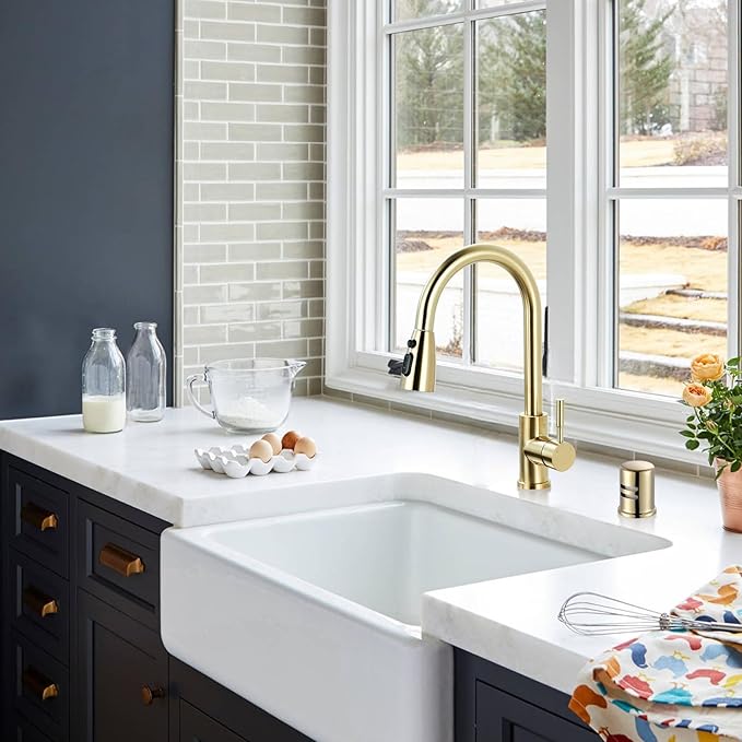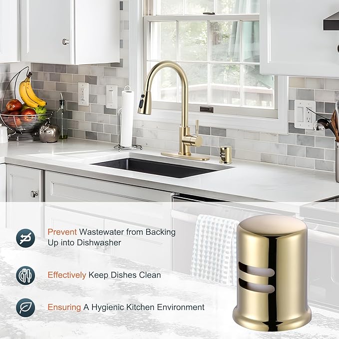 - Elegant and Stylish Design: Feature high-end polished brass finish, the dishwasher air gap cover kit not only enhances the visual appeal of your kitchen, but also includes a curved top design that prevents water vapor buildup, reducing the risk of paint peeling and maintaining a flawless appearance over time.