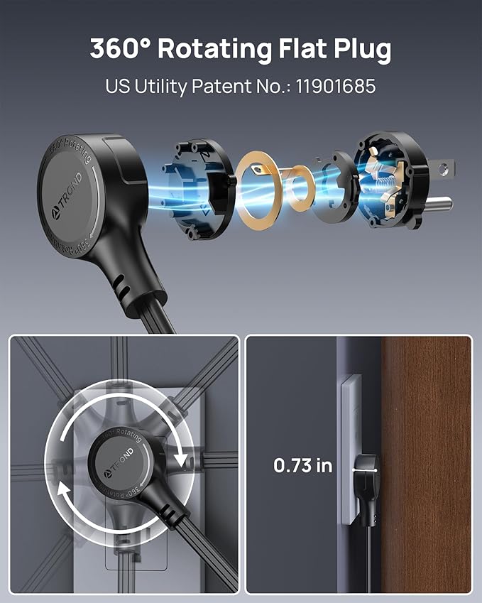 - 360° Rotating Flat Plug (US Patent No. 11901685): Design with a revolutionary 360° rotating plug that adapts to any wall outlet, combined with a wall-mountable slim profile to eliminate cord clutter - ideal for tight spaces behind furniture or dorm rooms