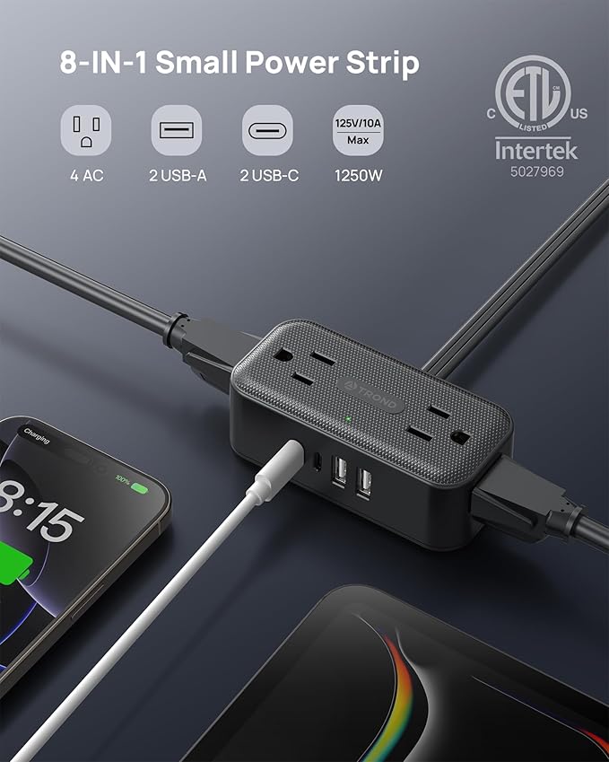 - 8-in-1 Charging Station: Strategically positioned ports allow simultaneous charging of 8 devices - from laptops to smartwatches - making it the ultimate solution for home offices and entertainment centers. Dual USB-C ports deliver 5V/3.0A fast charging for electronic devices, while USB-A ports provide 5V/2.4A optimized flow. Intelligent IC automatically adjusts output to prevent overcharging