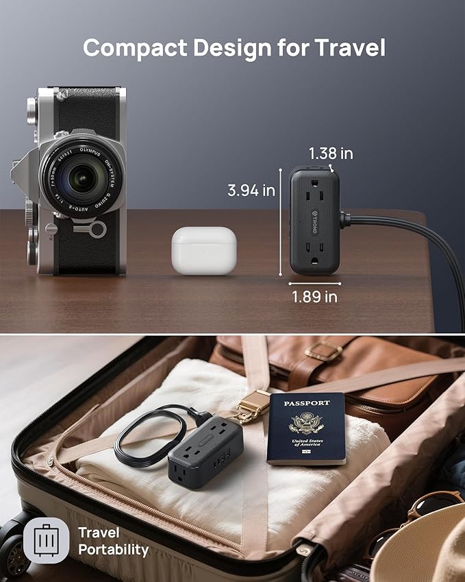 - Compact Size: Measured only 3.94” x 1.89” x 1.38”, this small power strip with USB is easy to pack in a bag or luggage when you travel around; comes with a cable tie for cable organization. The four small footprints on the flat extension cord fit perfectly on your desktop or workbench without slipping off