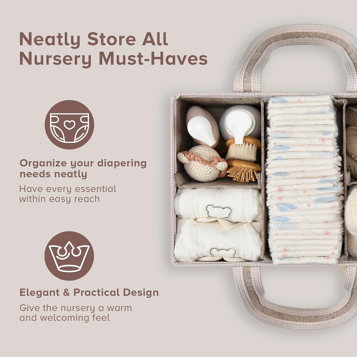 - VERSATILE AND PORTABLE DIAPER CADDY: With multiple compartments, you can easily store all of your baby stuff, baby toys storage, diapers, baby wipes, onesie, burp clothes, changing pads and other baby essentials. You can also use it as car baby organizers and storage