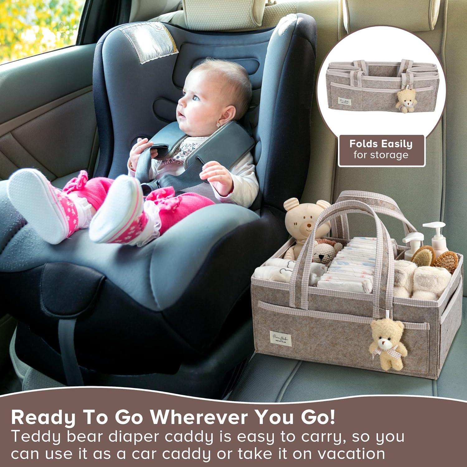 - STYLISH DESIGN AND BONUS TEDDY BEAR CHARM: Crafted with a premium felt exterior, your nursery decor with our neutral diaper organizer. It feels cozy & functional and it looks great on changing table and dresser. The caddy has 8 sturdy outer pockets for ample baby storage and a bonus teddy bear charm, adding a touch of delight