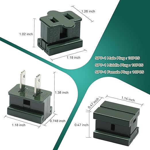 SPT-1 Male/Female Vampire Plug, Extension Cord Connector Combo Kit Green, Replacement Splice Zipper Plugs with SPT-1 Cable Adaptor Christmas Lighting String Extension Cord (10 pcs Plugs Each)
