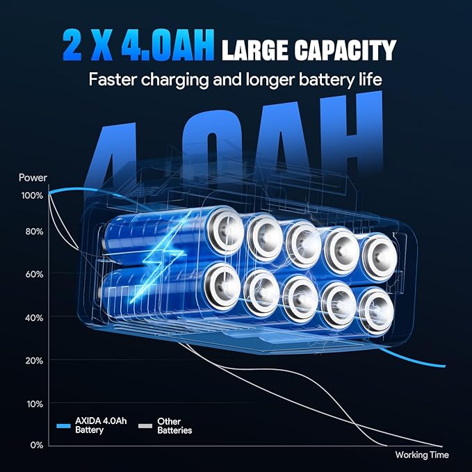 - 【2×4.0Ah High-Capacity Lithium-Ion Batteries】The Electric Impact Wrench features a fully upgraded battery structure: 1. Higher total battery capacity density for significantly enhanced energy storage; 2. Thickened circuit board paired with an upgraded chip, enabling stable handling of continuous high-current output; 3. Battery case made of nylon material with full-wrap rubber coating, effectively preventing damage from drops