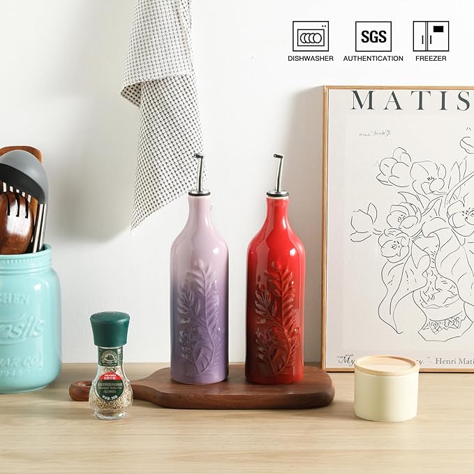 - Durable and Precise Pouring Control - The olive oil bottle fired at high temperatures, to form a smooth glazed surface, strength and durability. The carefully designed spout that allows for easy pouring without any messy drips or spills.
