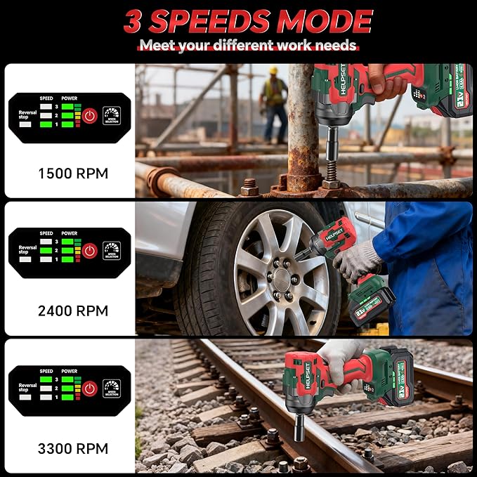 - 3 Speeds & 2 Modes – Versatility for Your Impact Wrench Socket Set: Switch between 3 speeds and 2 modes to match your project—pair with the included impact wrench socket set for maximum versatility. From delicate furniture assembly to truck lug nuts, this impact wrench adapts to every job with precision control.
