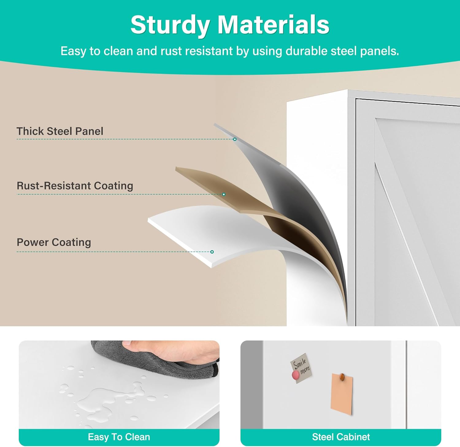 - Sturdy,Durable and Safe: Made of powder-coated steel plate, wide & deep cabinet with door and shelf is sturdy,durable and easy to clean.Load capacity is up to 120lbs each shelf. The included anti-tip kit helps secure the pantry cabinets to the wall to give you a safer living space.