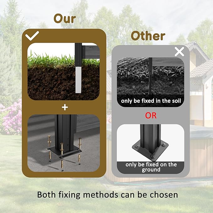 - More Fixing Methods: This privacy sceen panel is designed with upgraded aluminum stakes, there are two methods for you to install it. You can insert the panel into the soil with this upgraded aluminum support or you can fix the panel with extra fixing methods which is suitable for flat ground. That’ s all depends on your needs