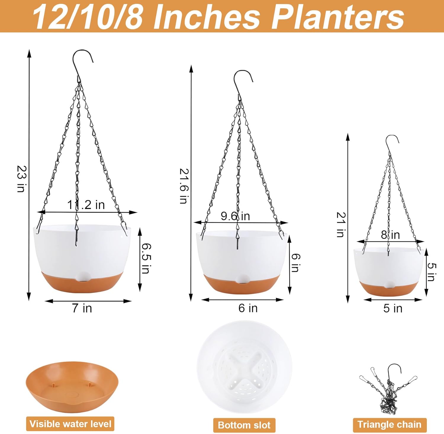 8/10/12 inch Hanging Planters for Indoor Outdoor Plants with Self-Watering Pots, 3 Pack Plastic Hanging Basket with Removable Tray for Home Garden Porch Balcony Patio Decor(White)