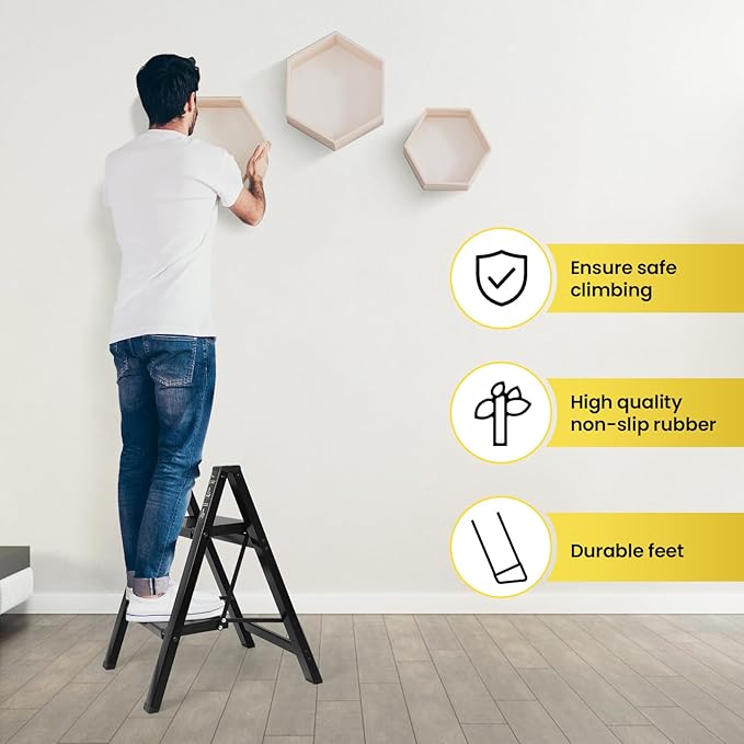 - Hassle - Free Setup: Ready to Use in an Instant. This ladders for home is designed for ultimate convenience, allowing you to open and fold it in a matter of seconds. No tools, no complex instructions - just quick, straightforward operation. Each step on this foldable step stool is thoughtfully spaced 9.4 inches apart. This distance provides a comfortable and secure footing, making it easy for you to climb up and down with confidence.