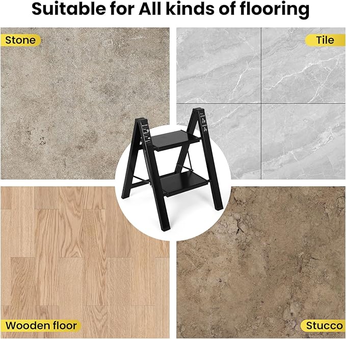 FAHKNS 2 Step Ladder, Aluminum Light Folding 2 Step Stool with Non-Slip Wide Pedal (7.9Inch), 330Lbs Capacity Stepping Stool, Step Ladder 2 Step Folding for Office,Household,Kitchen, Black
