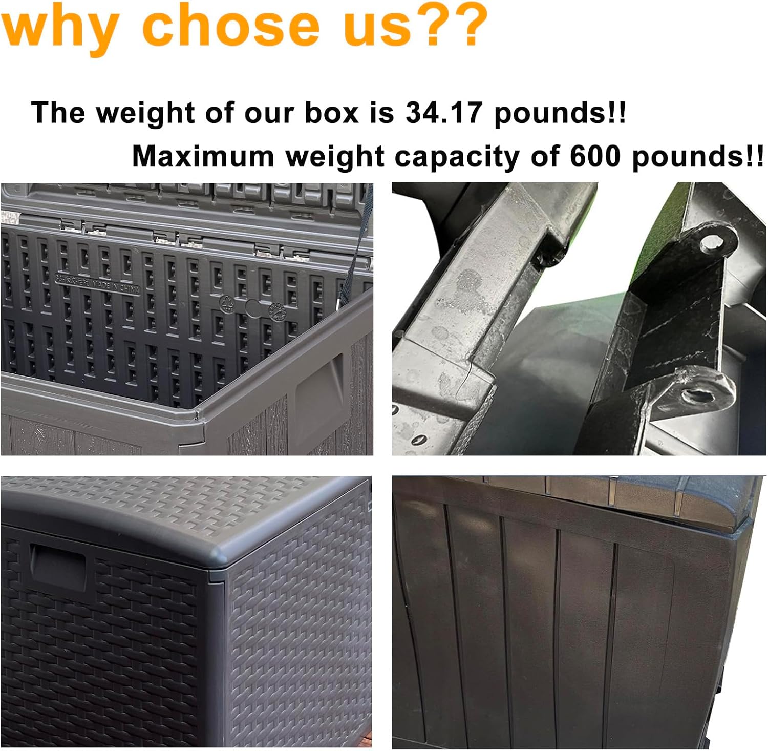 - Durable Resin Construction: Built with double-wall resin(HDPE), maximum weight capacity of 600 pounds,this outdoor waterproof deck box ensures long-lasting reliability and enhances strength and durability for long-term use,Our storage box is lockable, ensuring the safety of your belongings.