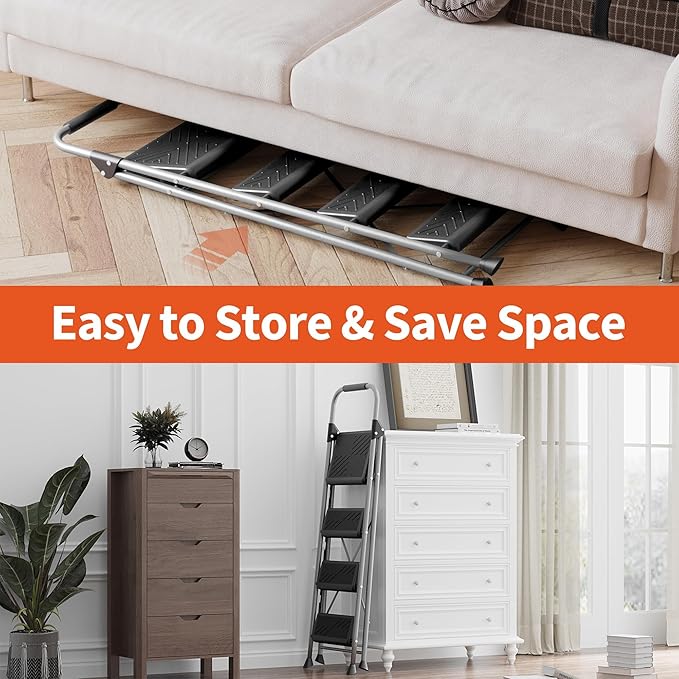 - Portable and Space Saving: This folding step stool folds to just 3 inches, making it easy to store against walls, in corners, under beds, or in closets. Made from high-quality lightweight steel, it's easy to carry with just one hand.