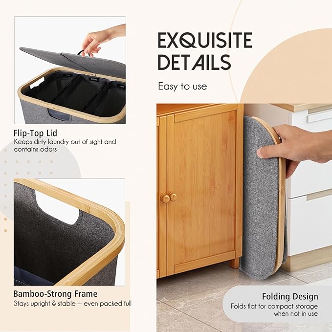 - Laundry Basket with Removable Bag: Crafted with premium polyester and reinforced bamboo frame, with waterproof coating, moisture-proof, tear resistant. The lid keeps dirty laundry discreetly hidden while blocking dust, control odors
