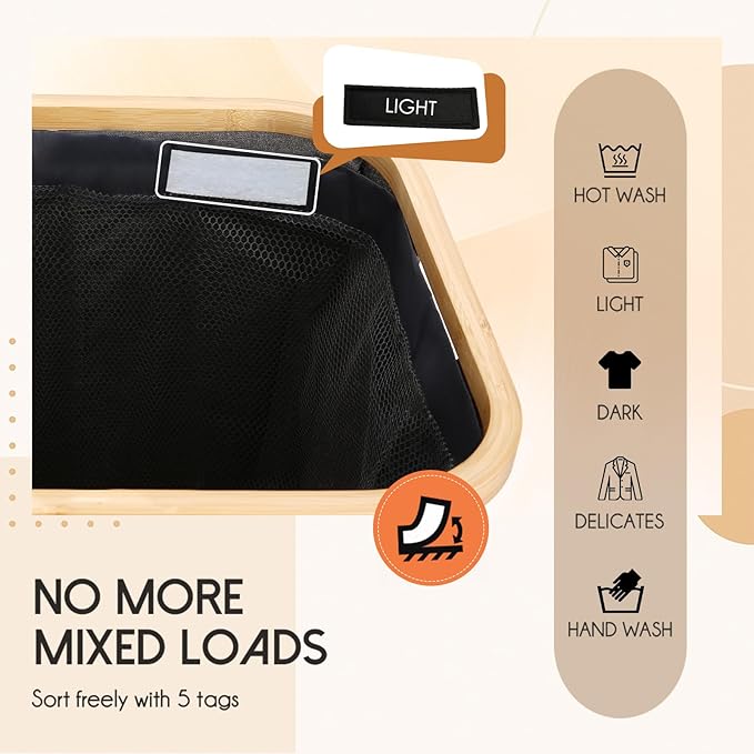- Sorting Laundry Hamper 3 Section: Equipped with three independent removable mesh bags, easy to distinguish between dark/light laundry, laundry to be washed, bedding, etc.; with five reusable labels to meet the needs of personalized pre-sorting. The inner pockets are secured by Velcro for easy removal and transportation