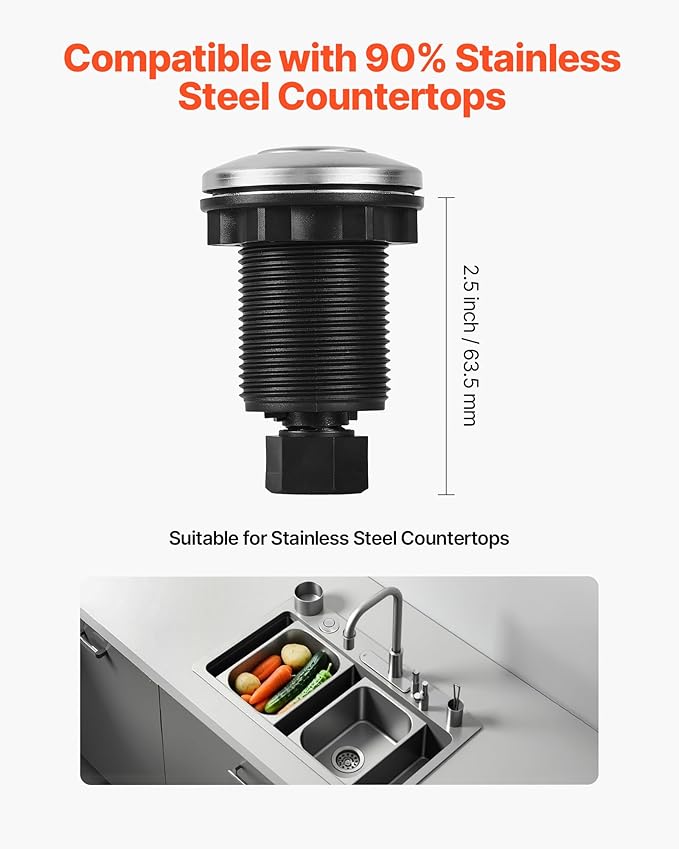 - Wide Compatibility: This VEVOR garbage disposal air switch kit fits standard sink hole diameters of 1.25–1.38 inch / 31.75–35.1 mm. The air switch button is 2.5 inch / 63.5 mm long, suitable for stainless steel sink countertops and compatible with most garbage disposal brands (≤2HP)